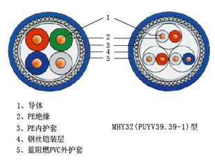 | MHY32(MHYV32、PUYV39、39-1、) | 煤礦用聚乙烯絕緣聚氯乙烯護套鋼絲鎧裝通信電纜 | 用于豎井或斜井作主信號傳輸能承受較大的拉力 |